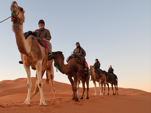 A la vuelta al hotel, nos esperan nuestros dromedarios para partir en una ruta de hora y media, abriéndonos paso entre dunas, hasta llegar al corazón del desierto para contemplar el bello atardecer. Arropados por la Gran Duna, y disfrutando de la música de los tambores, la cena y el té marroquí, podréis contemplar el inmenso cielo de estrellas y dormir en jaimas nómadas.